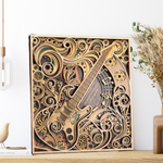 Each artwork features seven laser-cut layers of premium birch plywood, forming a mesmerizing combination of guitar silhouette, musical swirls, and rhythmic geometry.