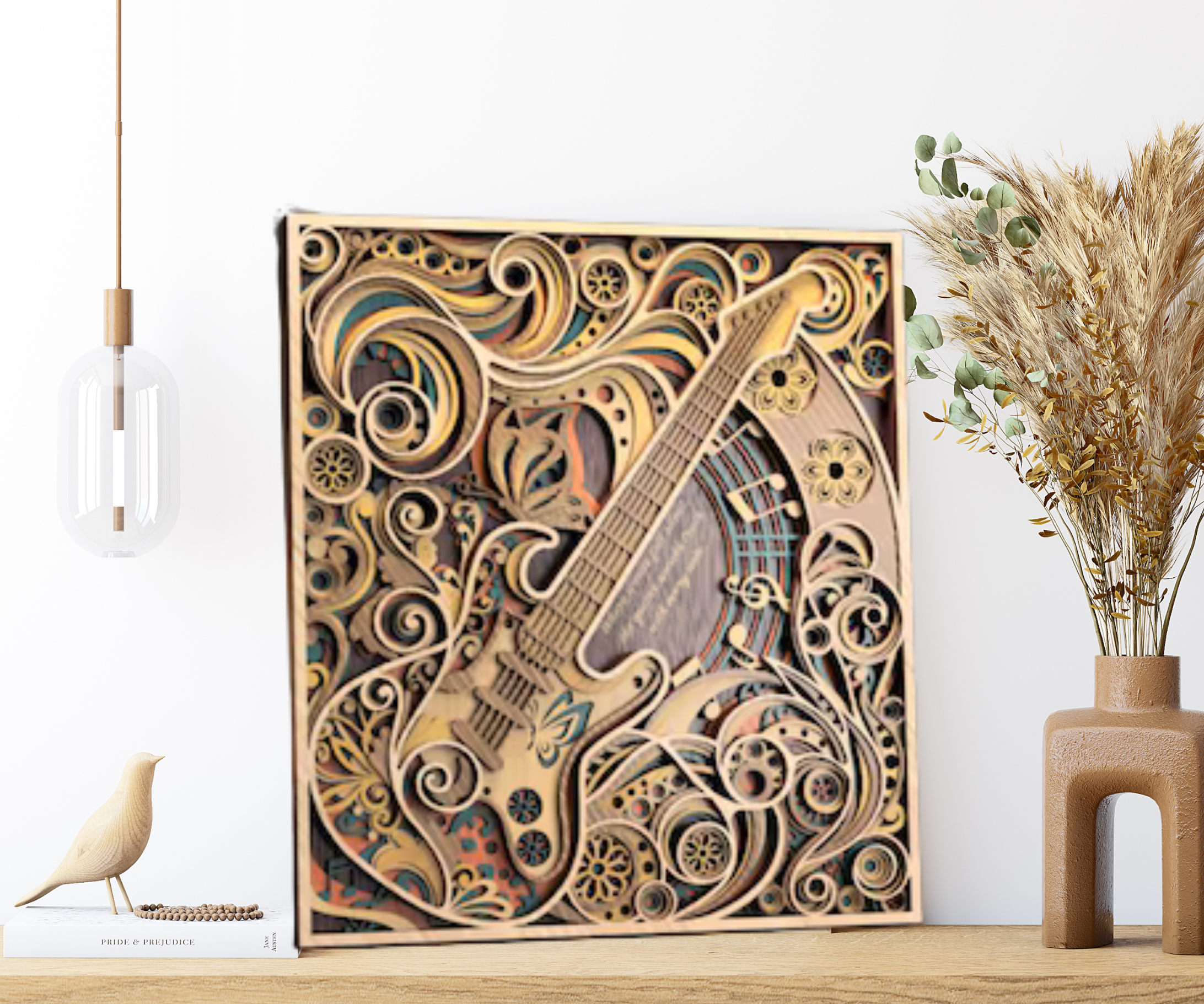 Celebrate music and craftsmanship with Rhythmic Pulse, a handmade 7-layer 3D guitar wall art crafted from precision laser-cut birch plywood.